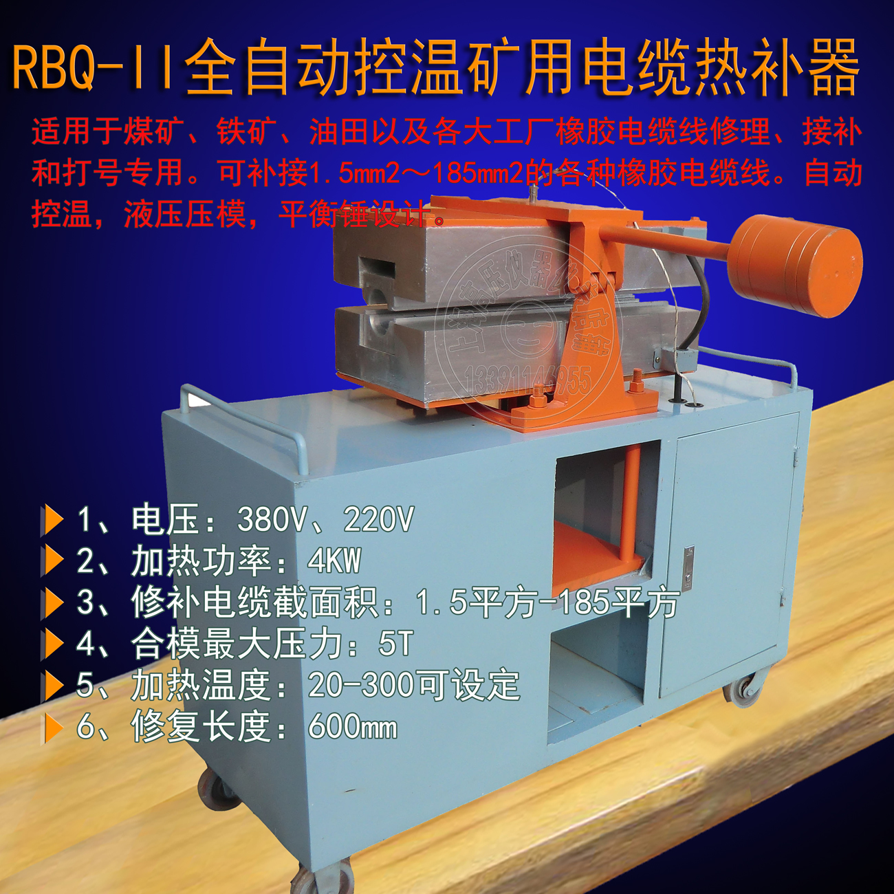 BLQ電纜熱補(bǔ)器用于橡套電纜的熱補(bǔ)工作中,對(duì)煤礦、鐵礦、鉆探和建井電纜的修理及壓號(hào)最為適用。電纜熱補(bǔ)器機(jī)采用優(yōu)質(zhì)合金鋁制成箱體和模具,液壓夾緊,以便指示溫度,自動(dòng)控溫報(bào)警,省力、節(jié)能,運(yùn)行可靠,工作效率高,維修簡(jiǎn)便,能保證修理質(zhì)量。電纜熱補(bǔ)器機(jī)修復(fù)后的電纜外觀光潔、平整、粘補(bǔ)牢固,耐壓密封,所以本電纜熱補(bǔ)器機(jī)是目前國(guó)內(nèi)先進(jìn)的熱補(bǔ)設(shè)備。
