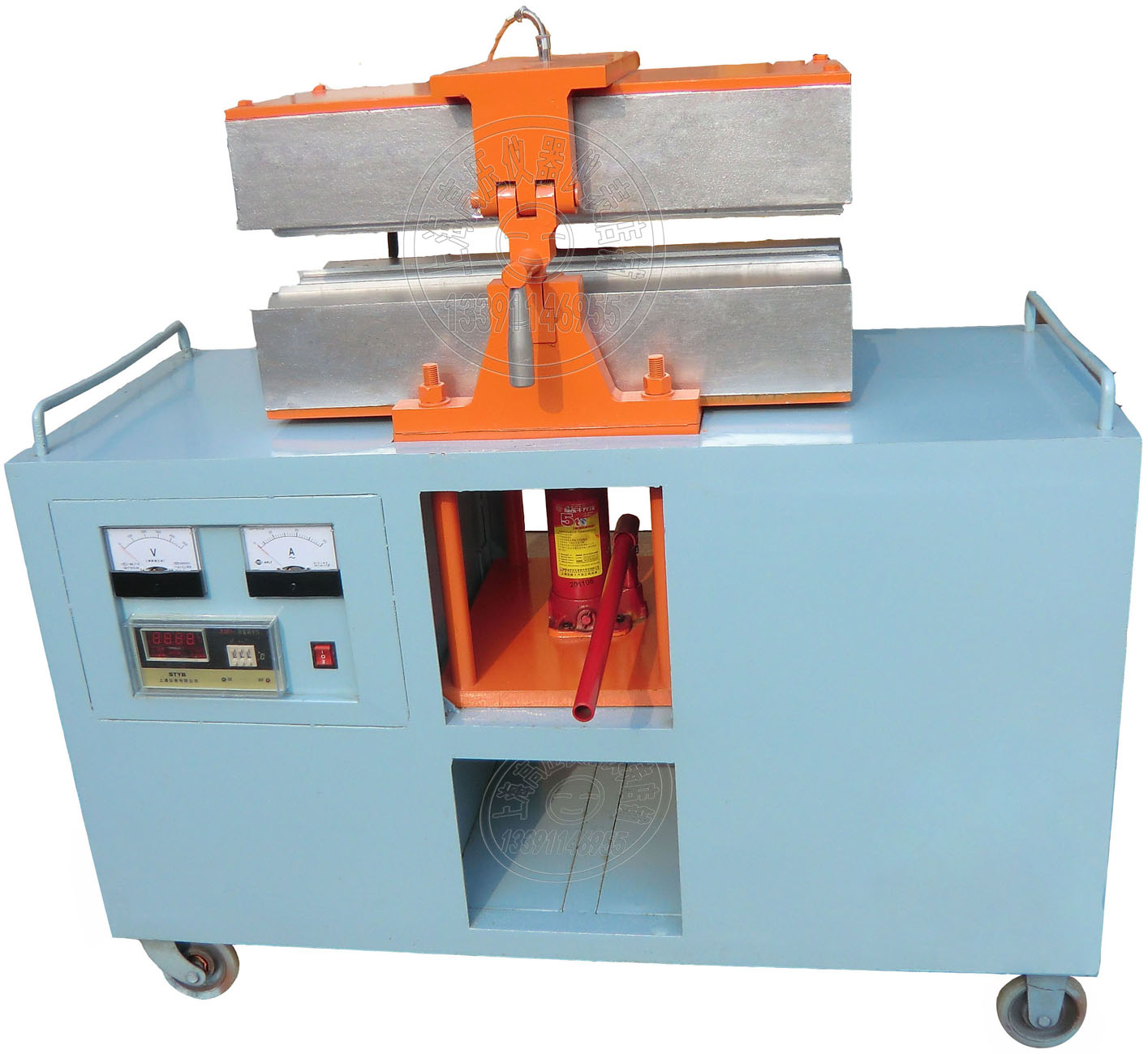 熱補(bǔ)機(jī)主要有支架、電氣系統(tǒng)、液壓系統(tǒng)、儀表控制板組成。液壓系統(tǒng)主要有液壓缸、活塞、閥和壓桿組成,完成模具升降加壓,保證加熱粘補(bǔ)過程所需的壓力;支架是熱補(bǔ)機(jī)的主體構(gòu)件,由型鋼焊接組成,并設(shè)有行走機(jī)構(gòu)、工具箱和配重鐵,形成完整的統(tǒng)一機(jī)臺(tái),在工作中移動(dòng)方便,電氣加熱系統(tǒng)分別組裝,統(tǒng)一控制,設(shè)有定溫、定時(shí)、燈光、電鈴報(bào)警裝置,形成良好的調(diào)整控制性能。