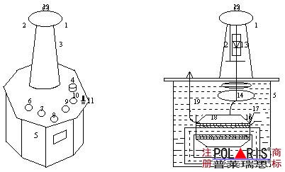 1-均壓球;2-硅堆短路桿;3-高壓套管;4-油閥;5-殼體;6、7-調(diào)整電壓輸入a、x端子;8、9-儀表測(cè)量E、F端子;10-高壓尾X端子;11-變壓器外殼接地端;12-高壓輸出A端子;13-高壓整流硅堆;14-內(nèi)部均壓環(huán);15-變壓器鐵芯;16-初級(jí)低壓繞組;17-測(cè)量?jī)x表繞組;18-次級(jí)高壓繞組;19-變壓器油。