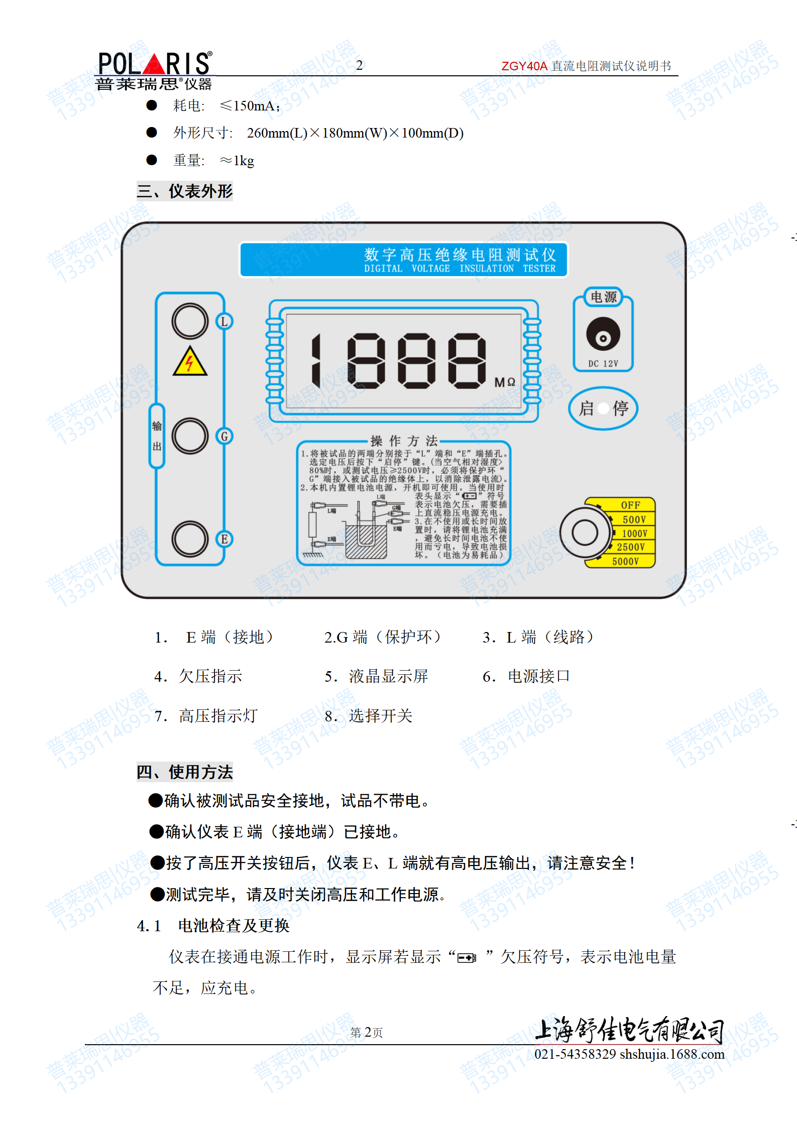 2LCD屏幕數(shù)顯,500V/1000V/2500V/5000V,負低耗電、12V/1.8AH鋰電池/AC220V供電。能承受短路和被殘余電壓沖擊。